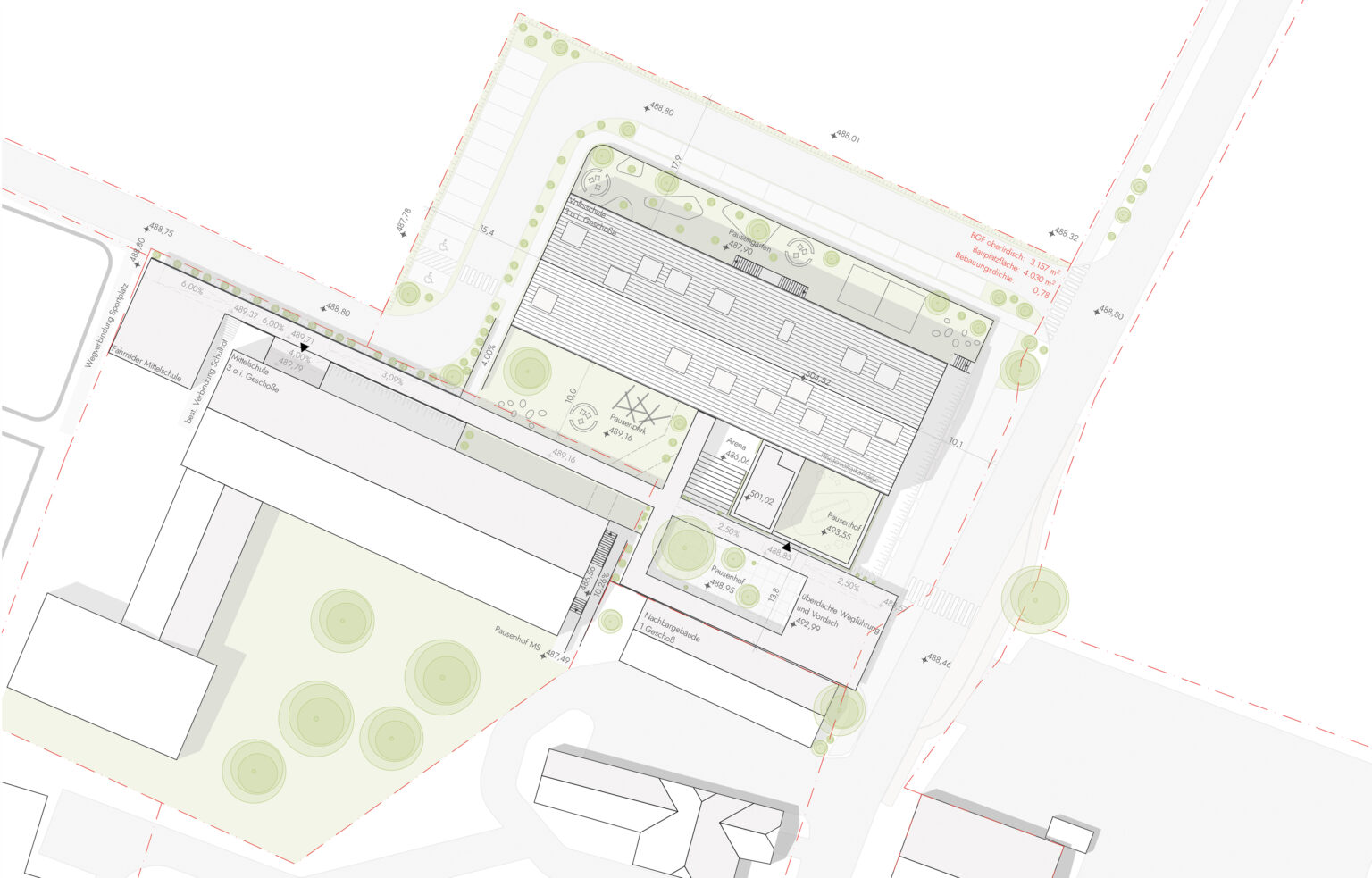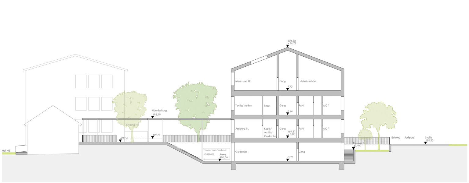 Städtebau & Barrierefreiheit Durch die Verlagerung der Schulstraße entsteht zwischen Volks- und Mittelschule ein geschützter Campus. Ein neues Eingangsgebäude im Südosten entknotet die bestehenden Höhensprünge und schafft einen sicheren Übergang zur Landesstraße. Der bestehende unterirdische Verbindungsgang wird durch eine Anhebung der Decke barrierefrei ertüchtigt und funktional aufgewertet.